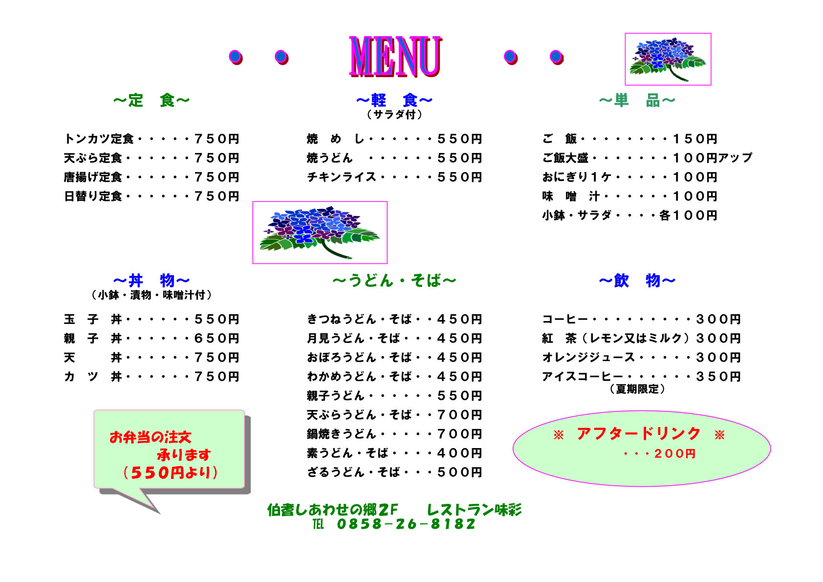 お昼ごはん味彩では、皆様においしいお昼ごはんを提供できるよう努めてまいりましたが、昨今の原材料の高騰などにより令和6年9月1日より商品の値上げをさせていただくことをお知らせいたします。